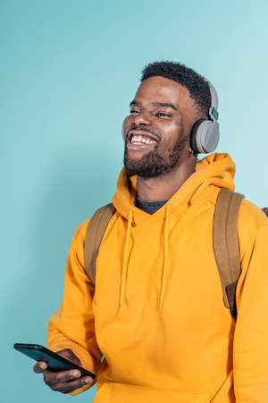 Stock photo of handsome african boy using phone and listening to music in studio shot.