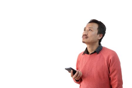 a man with a mobile phone in hand isolated in white background looking at a blank copy space