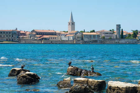 The historic medieval coastal town of Porec in Istria, Croatia, seen from the shore just north of the old town. Cormorants are on the rocks in the foreground