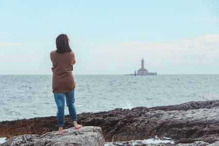 woman walking by rocky sea beach in wet jeans lighthouse on background. windy weather. summer vacation. carefree concept