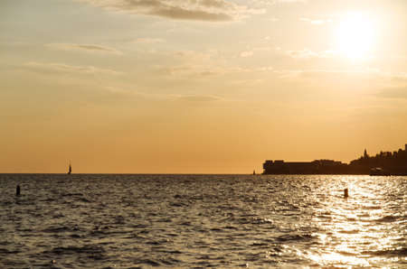 Picturesque seaside resort town in Slovenian coast against orange sunset sky in summer. Scenic view to Adriatic sea in the evening. Travel concept.