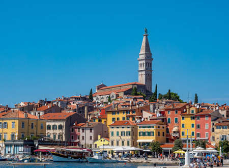 Rovinj, Croatia; 7/18/2019: Port of Rovinj with a lot of boats at the foreground and the old town and the tower of the Church of St. Euphemia at the background