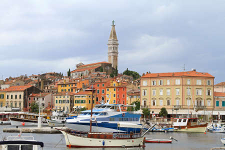 Rovinj city with port and tower landmark