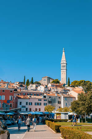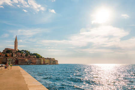 ROVINJ, CROATIA - AUGUST 30, 2018: The embankment and pier of Rovinj, Croatia. People walk and relax by the sea on the embankment of the historical famous tourist center of Croatia