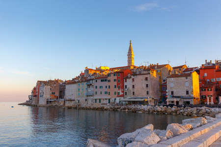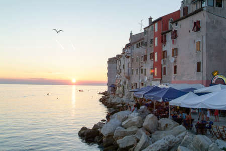 View of the typical croatian old houses in the coastline of the old town of Rovinj, Croatia, just on the Adriatic Sea, during the sunset