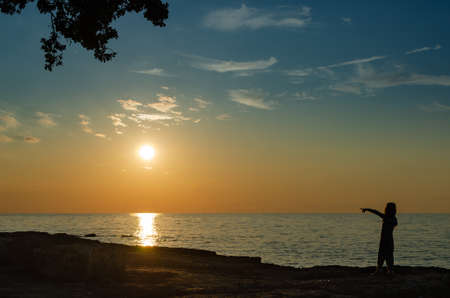 Kid girl standing on a beach, pointing to the sun