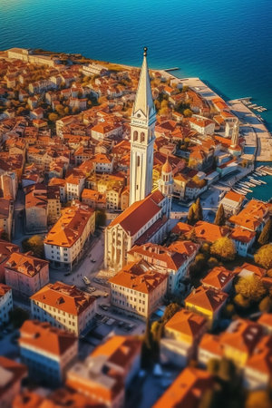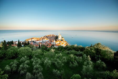 Aerial city scape view on Piran town with church tower and Adriatic sea in Slovenia. General plan with copy space