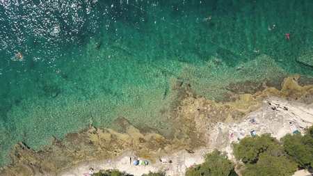 Aerial top down view of a rocky beach of the Adriatic sea. Summer vacation time