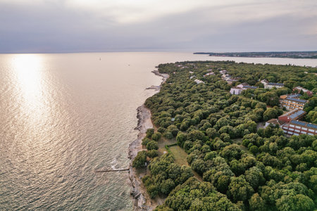 Aerial drone view of a forested Lanterna peninsula resort complex in Istria, Croatia, surrounded by clear Adriatic waters with hotels and recreational facilities. Novigrad town in the background.