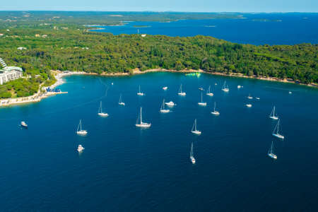 Luxurious yachts drift on calm surface of Adriatic sea bay near peninsula. Dense green forests surround Croatian town Rovinj. Aerial panorama