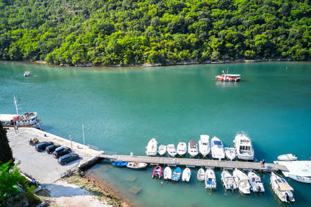 Jetty with motor boats on the Lima Canal in Croatia. Shooting from a drone.