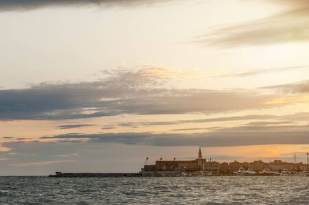 Sunset above the adriatic sea in Piran city, Slovenia. Old ancient and mediaveal city, view from coast and harbor. Old stones in foreground, beautiful clouds on sky, romantic sunset above city