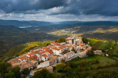 Groznjan. Ancient hill village of Groznjan at sunset aerial view, artist colony in Istria region of Croatia