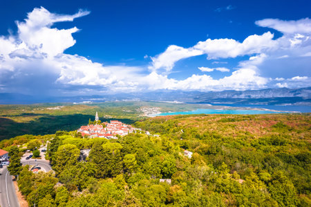 Historic town of Dobrinj and turquoise Soline bay aerial panoramic view, Island of Krk, Kvarner Gulf of Croatia