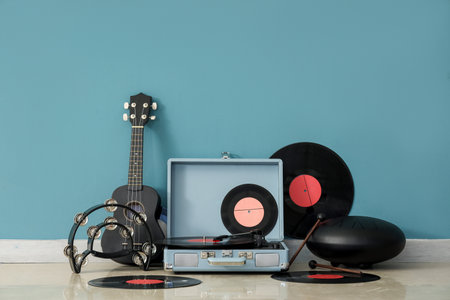 An artistic flat lay featuring a vinyl record, musical instruments, and decorative stones, perfect for showcasing music, creativity, and vibrant aesthetics.