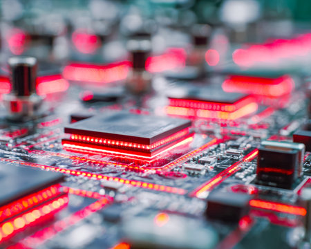 A detailed view of a circuit board illuminated by intense red LEDs, emphasizing intricate electronic parts and soldered connections for tech enthusiasts