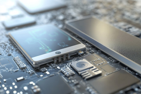 A detailed look at smartphone parts on a circuit board, highlighting modern technology and design.