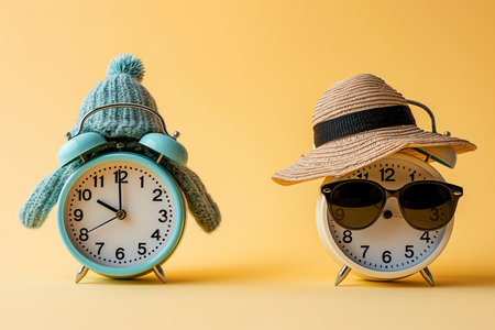 Spring forward fall back concept. Alarm clocks dressed in winter and summer accessories. Summer hat and glasses and winter hat as a symbol of season and time change. Switch to summer or winter time.