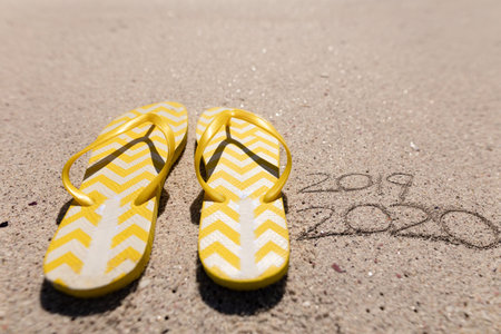2019 and 2020 written in the sand on a sunny beach with calm sea and clear blue sky, the tide washing away the year 2019, new year and new years eve concept