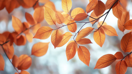 Vibrant orange and red leaves on a tree branch, gently swaying in the autumn breeze, a perfect representation of the fall season.