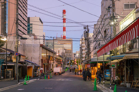 TOKYO,JAPAN - DEC 10 : View of Tsukiji fish market with retail shops and restaurants carter in Tokyo on December 10, 2016