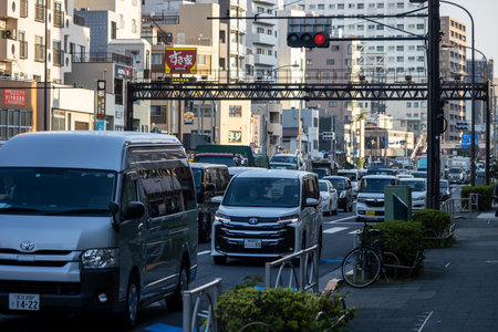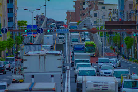 A cityscape of traffic jam at the downtown street in Tokyo wide shot
