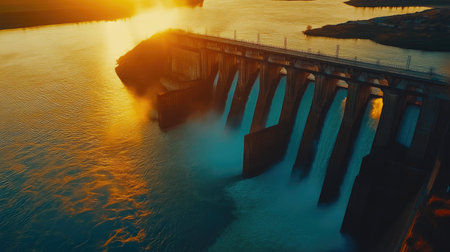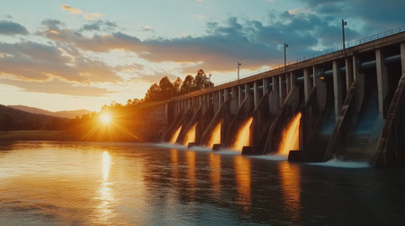 A hydroelectric dam at sunset, the warm, soft light reflecting off the water symbolizing the generation of clean, renewable energy