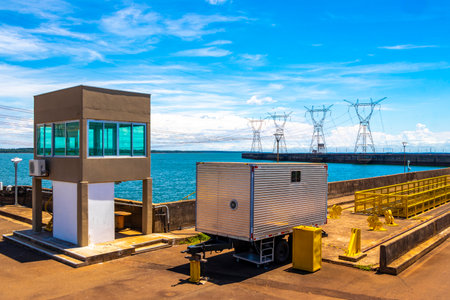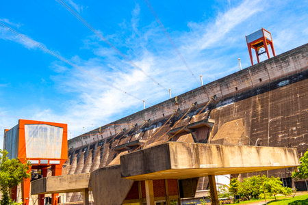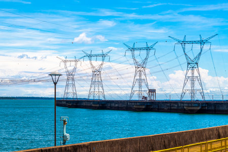 Brazil's largest dam in the world Itaipu for energy production on the border with Paraguay electricity pylons power poles building water river and blue sky in Foz do Iguacu State of Parana Brazil.