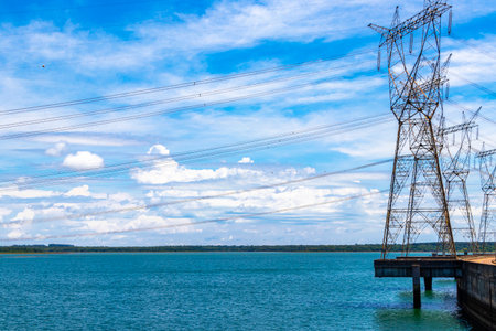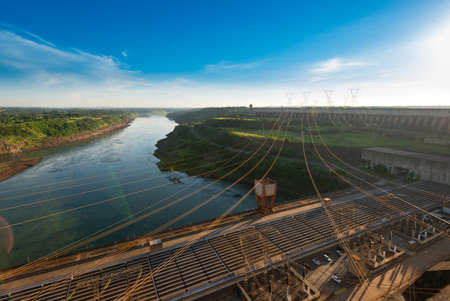 Power lines next to Itaipu dam on river Parana on the border of Brazil and Paraguay