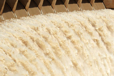 Strong flowing water released from the open sluice gates of a large dam