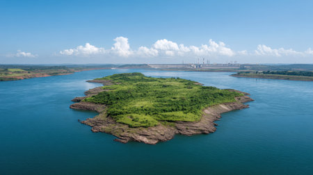 Beautiful aerial view showcasing a green island amidst calm blue waters under a clear sky, with an industrial backdrop, perfect for nature and travel themes.