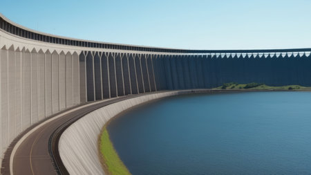 Majestic curve of a modern concrete dam overlooking tranquil waters and blue sky