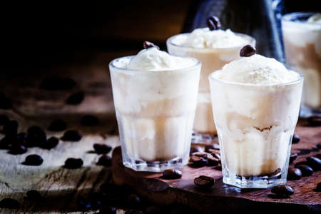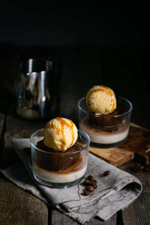 Summer refreshing dessert with coffee and vanilla ice cream, vintage wooden background, selective focus