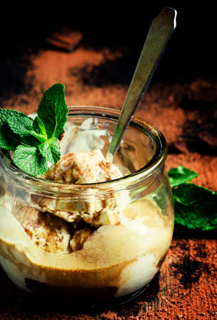 Dessert with ice cream and black coffee, decorated with chocolate chips and mint, selective focus