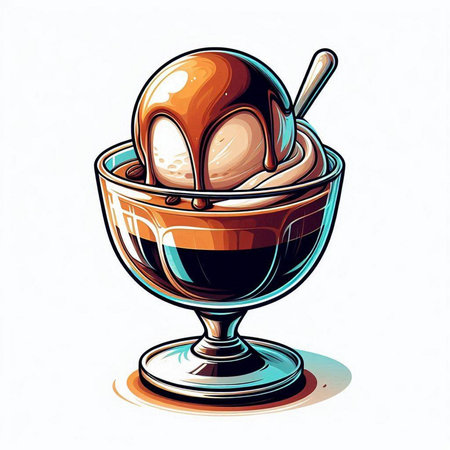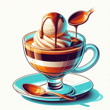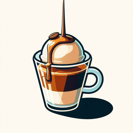 Illustration of a cup of coffee with ice cream and caramel syrup