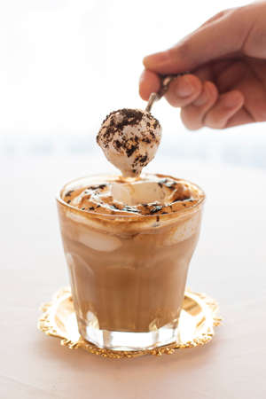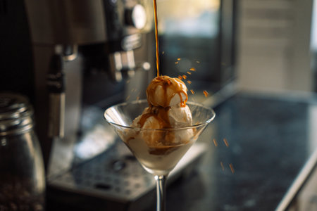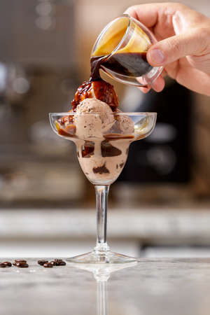 Ready-made dessert ice cream with coffee and sugar syrup in front of coffee machine