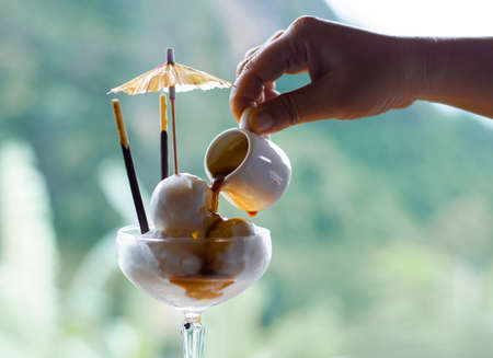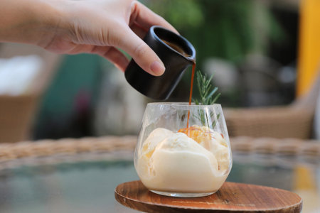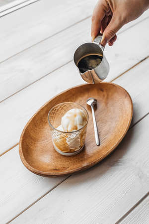 Pouring coffee on ice cream to make an affogato coffee on a garden table background.