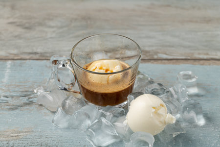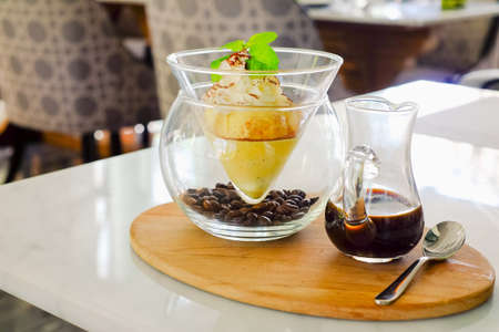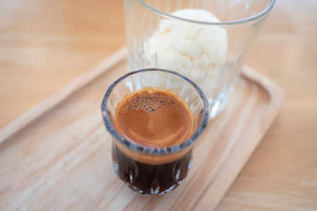 Close up of delicious sweet affogato coffee with creamy ice cream in a cup on the table top view