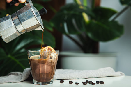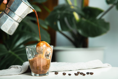 homemade Affogato, Italian Moka pot coffee , affogato is dessert with coffee as base ingredient typically scooping a scoop of gelato or vanilla ice cream into a cup.