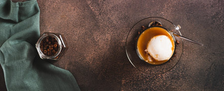 Affogato espresso coffee with vanilla ice cream in a cup on the table top view web banner