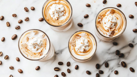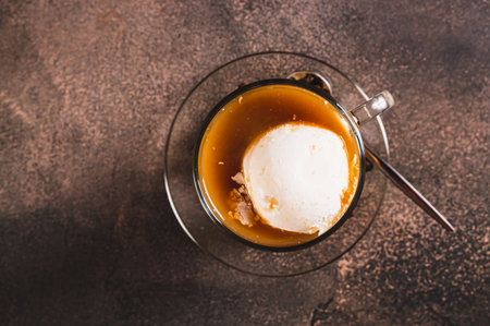 Affogato coffee, espresso shot with salted caramel ice cream on classic marble table background, top view.
