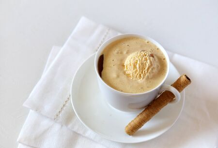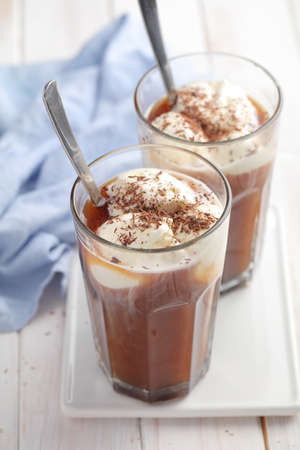 Summer cold cocktail. Amaro floats with chocolate and vanilla ice cream. Affogato Coffee latte with ice cream drink. Copy space on a white table
