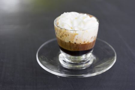 Delicious affogato prepared with a coffee capsule and a scoop of vanilla ice cream served in a small transparent glass on a table.