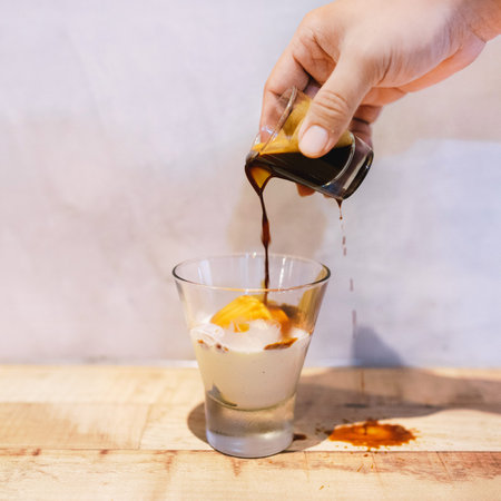 Close-up of espresso being poured over vanilla ice cream in a glass cup, creating a classic affogato dessert on a wooden table.