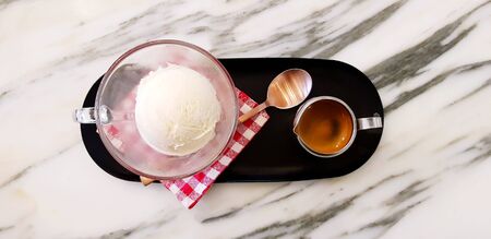 Affogato coffee dessert, Flat lay Cup of vanilla ice cream with espresso and tea spoon putting on red plaid cotton with stainless mug shot in black tray on white marble table with copy space- Refreshment drink