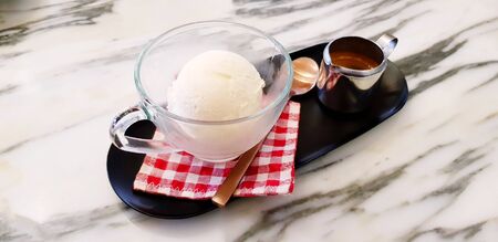 Affogato coffee dessert, Cup of vanilla ice cream with stainless mug of espresso shot, copper tea spoon and red plaid cotton in black tray on white marble table with copy space - Refreshment drinking
