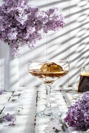 ice cream is in a glass, next to coffee and lilac. Glasse coffee consists of ice cream and espresso