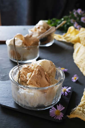 Ice cream vanilla and chocolate balls in glass on white table background, vertical