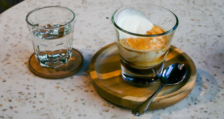 Table corner view of yogurt coffee resembling affogato, creamy top, served with water on engraved coaster. Captured in Hanoi cafe with warm lighting and speckled tabletop for artisan ambiance. Vietnam