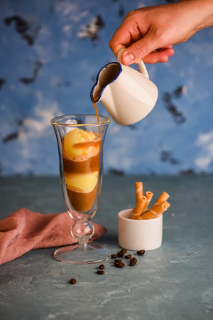 Man's hand pouring espresso coffee into the glass with chocolate ice cream scoops, Affogato recipe
